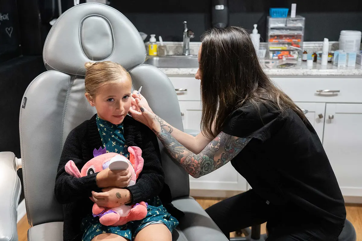 We’re good with first-timers. The team moves at your child’s pace and talks through each step. When appropriate, two clinicians can coordinate to pierce both lobes at the same time.